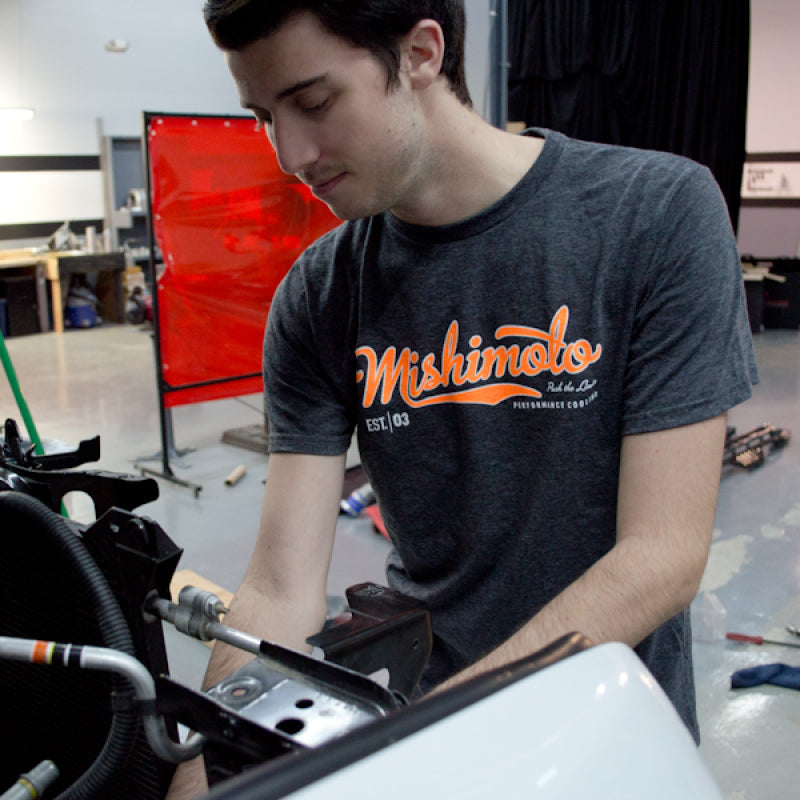 Mishimoto Men's Athletic Script T-shirt.A classic crew-neck t-shirt featuring a two-color, neon orange and white screen print.Great for wrenching in the garage, cruising the streets, or hitting the track.Available in Stealth Black or Heather Gray.